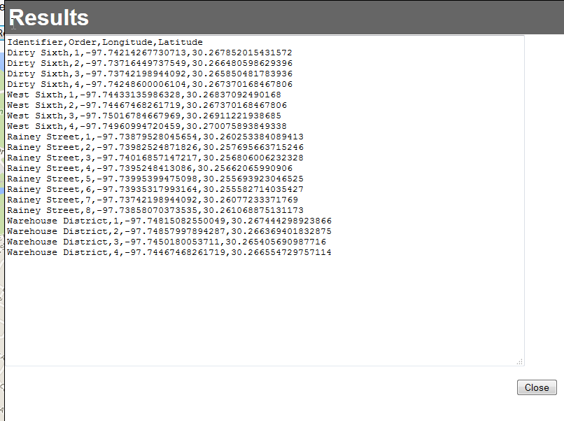 which will pop open a dialog box with the CSV output. Copy this CSV into a text file and save, or paste it directly into Tableau. Now you have the data for your polygons.
