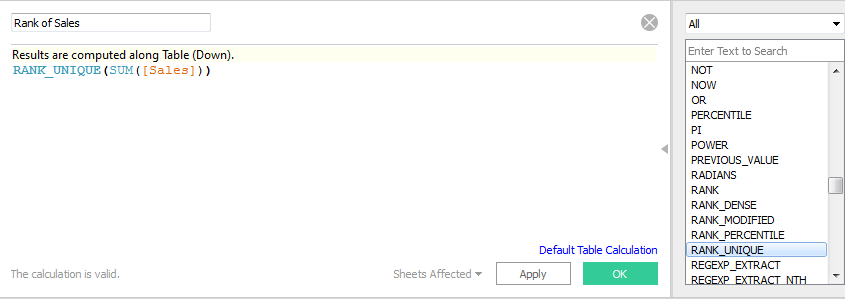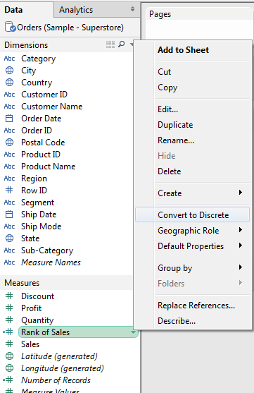 Now (this is new in 9.0), Ctrl-drag the Rank calc over into the Measures pane. You should see a “Rename Field” popup — call it Rank of Sales. Now right-click and convert it to Discrete from Continuous.