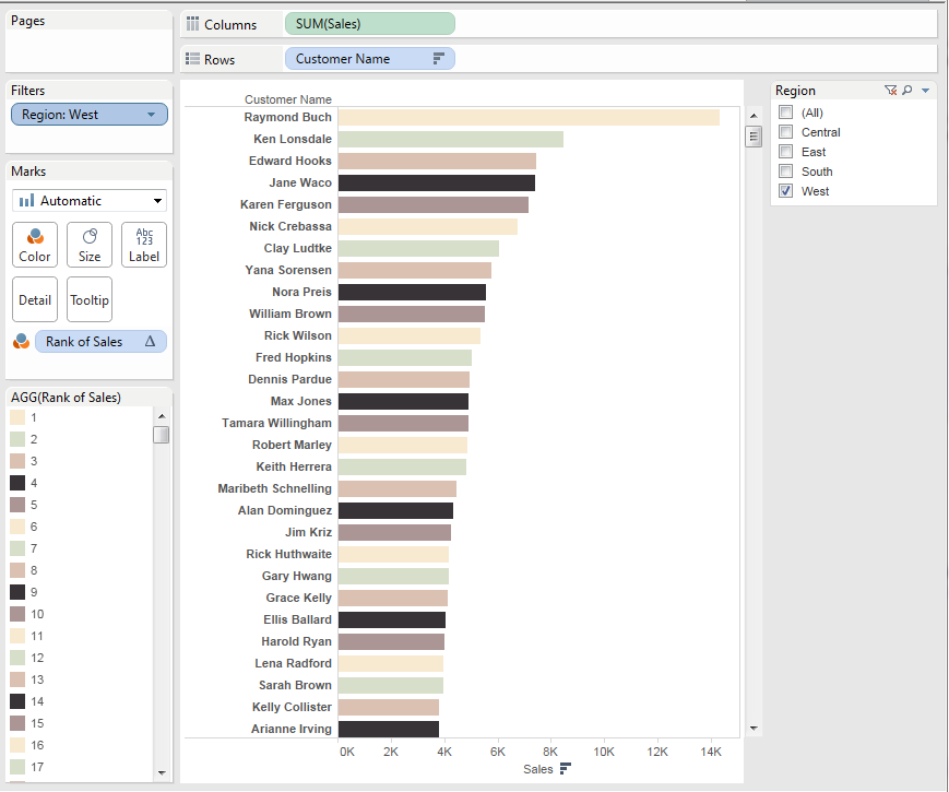 You don’t have to use the same calculation as what you are showing; you can modify the rank calc however you’d by editing the Calculated Field. In fact, the default RANK() function will assign the same rank if the values of the measure are identical. If you want to make sure you never have the same colors next to each other, you’ll need to switch to RANK_UNIQUE()